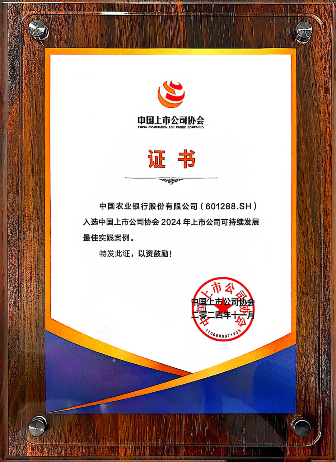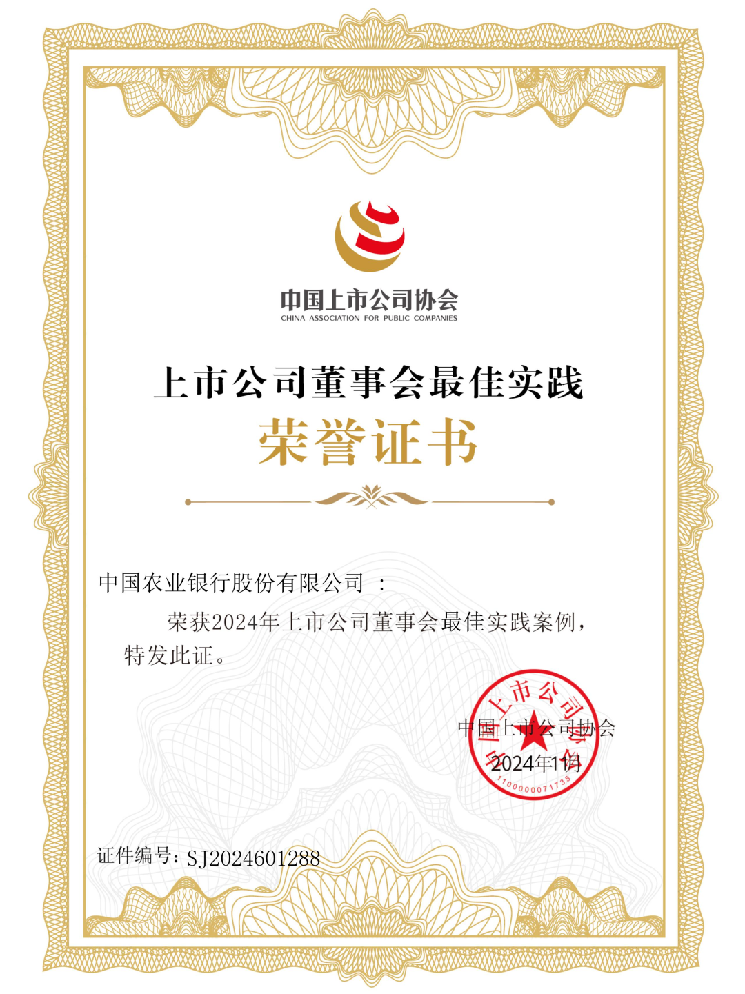 近日,中国上市公司协会在北京举行“2024上市公司董事会最佳实践”和“2024上市公司可持续发展最佳实践”获奖榜单发布仪式,农业银行获两项“最佳实践案例”。本次获奖体现了监管机构和资本市场对农业银行董事会合规运作、可持续发展与创新实践的高度认可。