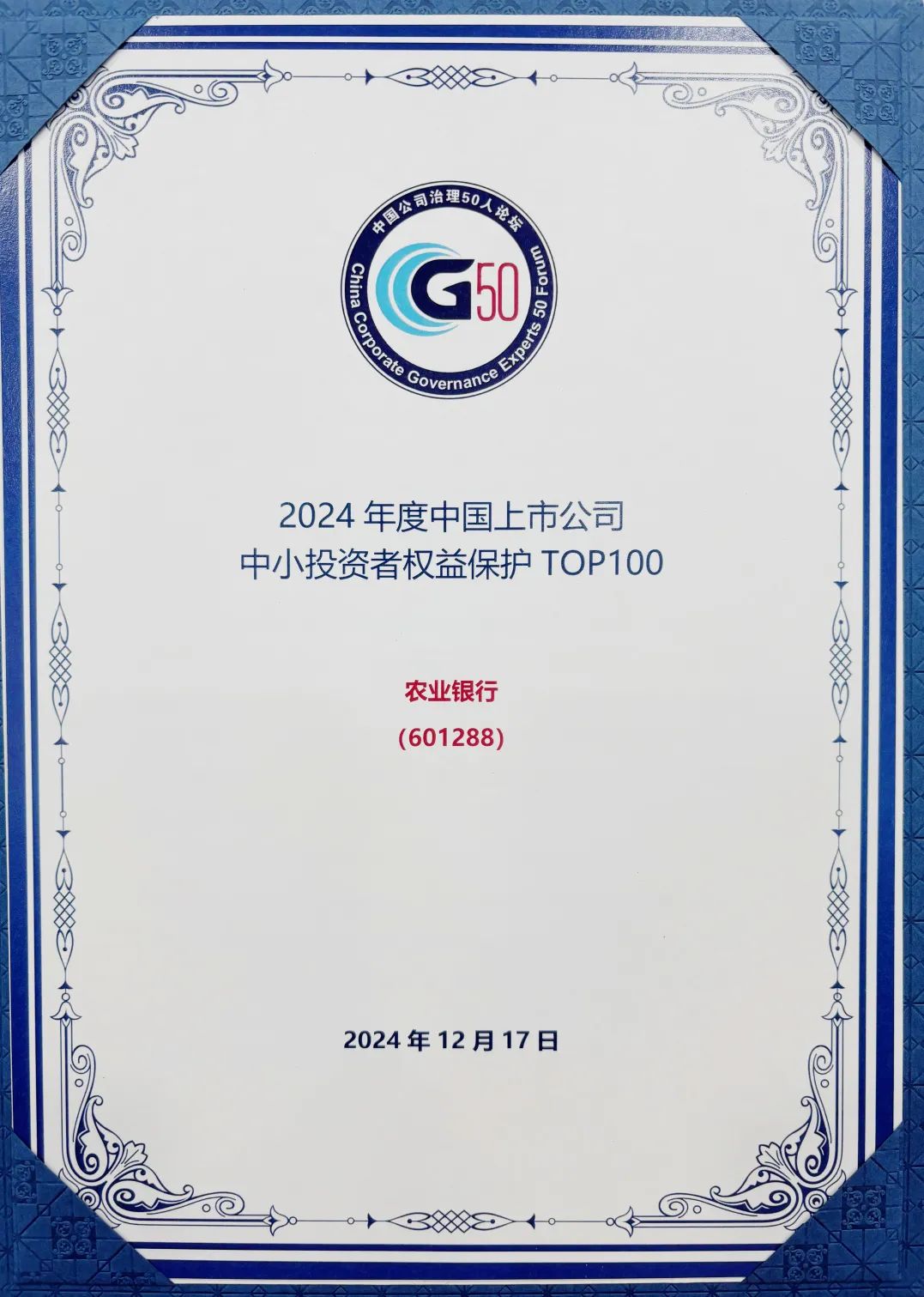 近日,在第五届中国公司治理50人论坛上,农业银行荣获“2024年度中国上市公司中小投资者权益保护TOP100”奖项。该奖项从5300余家上市公司中评出,农业银行为可比同业中唯一获奖银行。