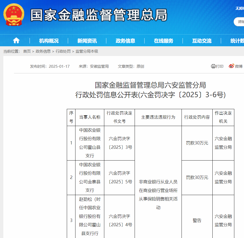 处罚文件披露,中国农业银行霍山县支行和中国农业银行金寨县支行存在“非商业银行从业人员在商业银行营业场所从事保险销售相关活动”违法行为,分别被六安金融监管分局处以罚款30万元处罚。中国农业银行霍山县支行时任行长赵劲松和金寨县支行时任行长张霞分别被六安金融监管分局处以警告处罚。
