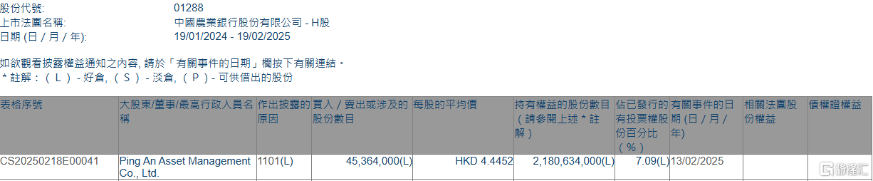 根据联交所最新权益披露资料显示,2025年2月13日,农业银行(01288.HK)获Ping An Asset Management Co., Ltd.在场内以每股均价4.4452港元增持4536.4万股,涉资约2.02亿港元。