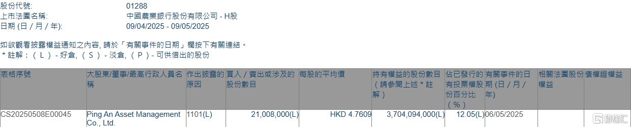 根据联交所最新权益披露资料显示,2025年5月6日,农业银行(01288.HK)获Ping An Asset Management Co., Ltd.在场内以每股均价4.7609港元增持2100.8万股,涉资约1亿港元。