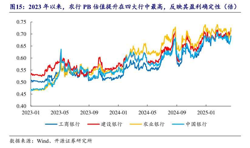 第二,2023年以来农行PB估值由四大行最低上升至最高水平,主要源于其盈利确定性在四大行中最高,强化其红利属性。一方面,农行超额损失准备对资本充足率提升较大,故释放拨备对资本影响有限;另一方面,农行损失类贷款占不良比重较低,同时拨备充足,故贷款风险结构更优,拨备调节盈利空间更充分。