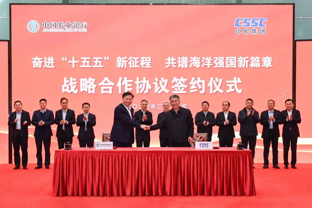 3月9日,中国农业银行与中船集团以“奋进‘十五五’新征程,共谱海洋强国新篇章”为主题签署战略合作协议。中国农业银行董事长谷澍、中船集团董事长徐鹏出席签约仪式。农业银行副行长王大军和中船集团总会计师朱永红分别代表双方签署战略合作协议。