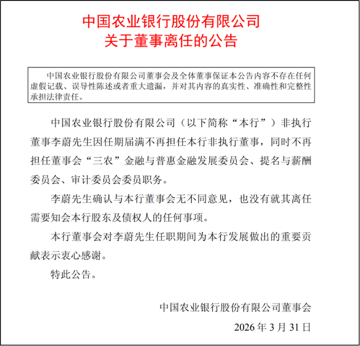 业绩发布会召开第二天,农业银行还发布公告称,董事李蔚因任期届满,不再担任该行执行董事。公开资料显示,李蔚出生于1966年5月,浙江宁波人,毕业于浙江财经学院财政专业,曾先后任职于财政部驻宁波市财政监察专员办事处和中央汇金投资有限责任公司。