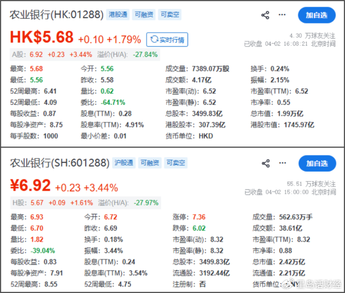 发布会当日,农业银行股票继开盘后持续走高。截至4月2日收盘,A股报6.92元/股,涨3.44%,总市值2.42万亿元;港股报5.68港元/股,上涨1.79%,总市值1.99万亿港元。
