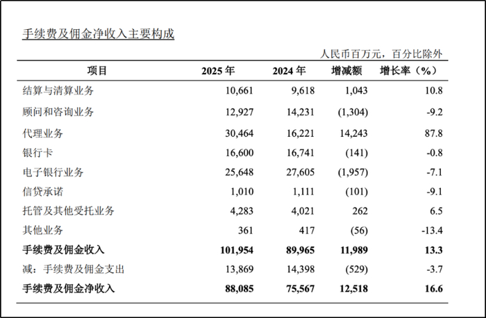 从具体业务板块来看,2025年农业银行手续费及佣金净收入表现亮眼,全年实现880.85亿元,较上年增加125.18亿元,同比增长16.6%。其中,代理业务同比增长87.8%,主要得益于该行深入推进财富管理业务转型,理财和代销基金收入稳步增加。