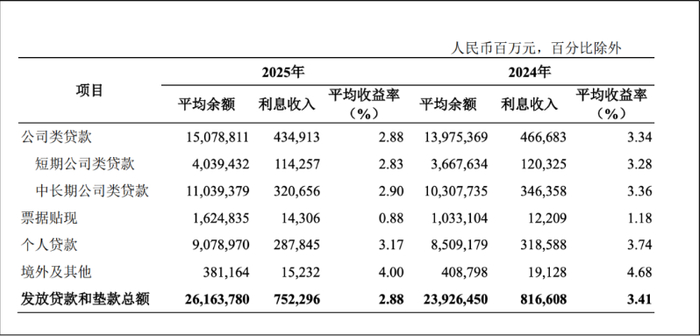 尽管消费贷款增长喜人,农业银行仍未能摆脱行业普遍面临的利息净收入下滑、净息差持续收窄的困境。2025年,在平均贷款余额同比上涨的情况下,该行公司、个人贷款利息收入均出现下降:公司贷款利息收入同比下滑6.8%,个人贷款利息收入同比下滑9.6%,平均收益率分别下降0.46和0.57个百分点;境外贷款表现更弱,平均余额和利息收入双双下滑,发放贷款金额下降2.22%,吸收存款金额下降2.0%。