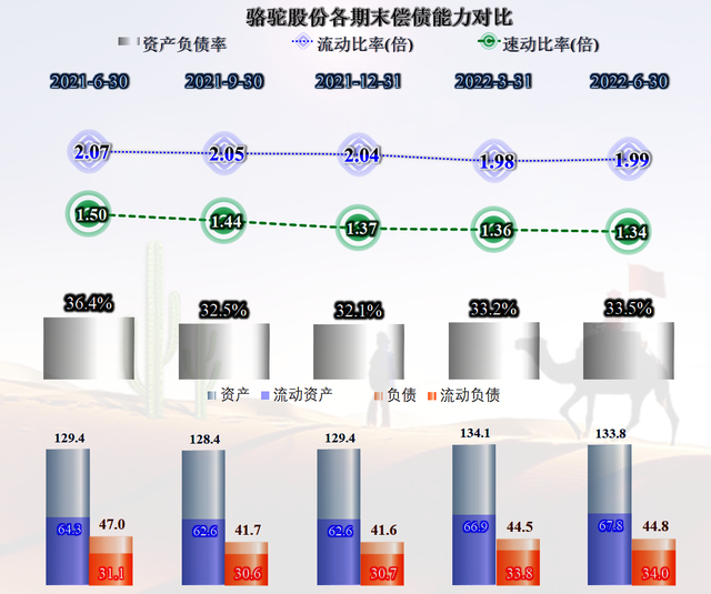 长期盈利的公司,如果不是步子迈得太大,一般不会出现流动性问题的,也就是偿债能力是不错的。骆驼股份这方面的能力还是很强的,资产负债率才33.5%,流动比率1.99,速动比率1.34,都是相当优秀的表现。