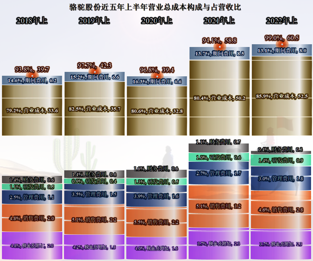 2021年上半年,骆驼股份的销售利润率就只有6%左右,毛利率的下降导致2022年上半年,销售利润率只有1%了。这还得益于期间费用在营收下降的情况下,占营收比还下降了0.6个百分点,不然情况会更糟。