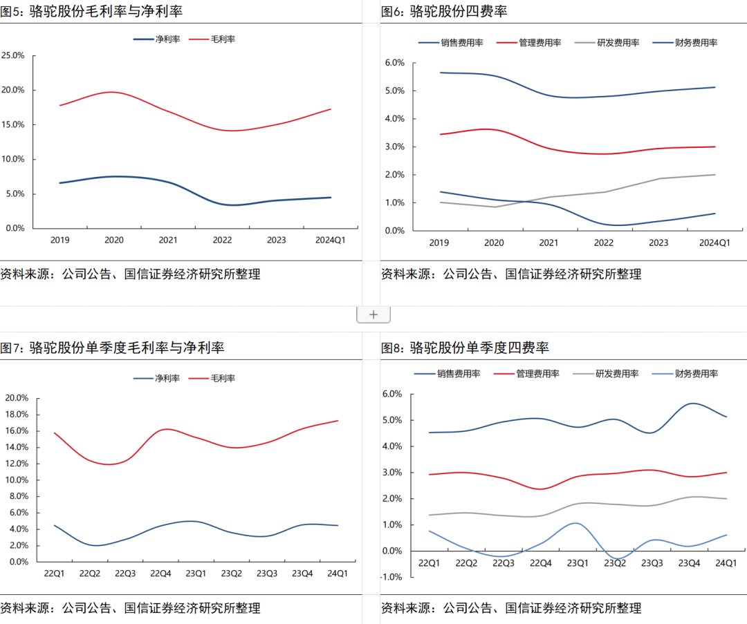 费用管控稳定,毛利率同环比提升。24Q1骆驼股份毛利率为17.28%,同比+2.1pct,环比+1.0pct,盈利能力同环比改善,24Q1销售/管理/研发/财务费用率为5.1%/3.0%/2.0%/0.6%,同比分别+0.4/+0.1/+0.2/-0.5pct,环比分别-0.5/+0.2/-0.1/+0.4pct,公司持续重视研发,坚持以市场和产品为导向的研发机制,在技术突破、项目对接、产品矩阵开发、专利创新等方面都取得了显著的成绩,有效提升了生产效率,生产成本实现进一步降低。整体来看公司费率管控稳定,净利率4.49%,同比-0.5pct,环比-0.1pct。