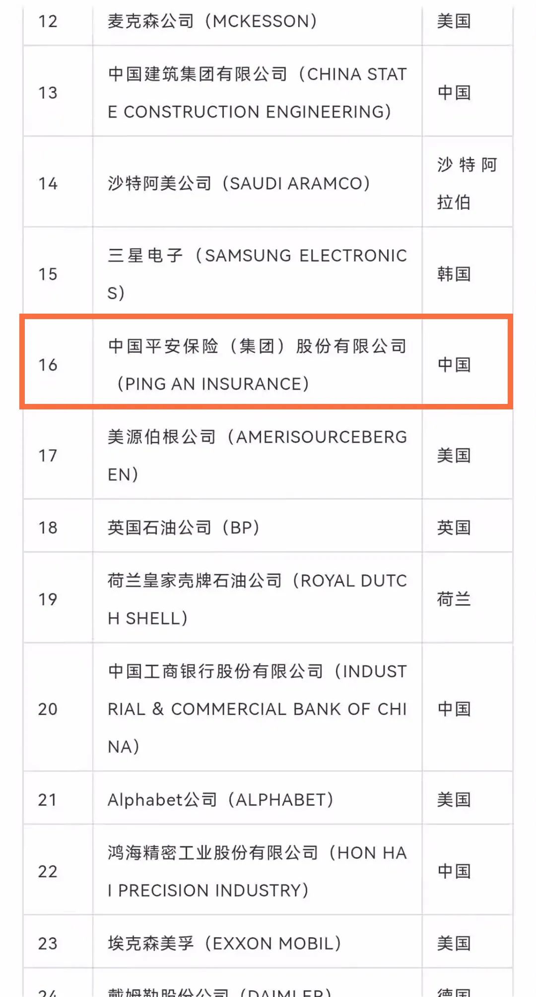 榜单显示,除中国平安外,榜单中前20强的中国企业还包括:国家电网(2位)、中石油(4位)、中石化(5位)、中国建筑(13位)、中国工商银行(20位)。