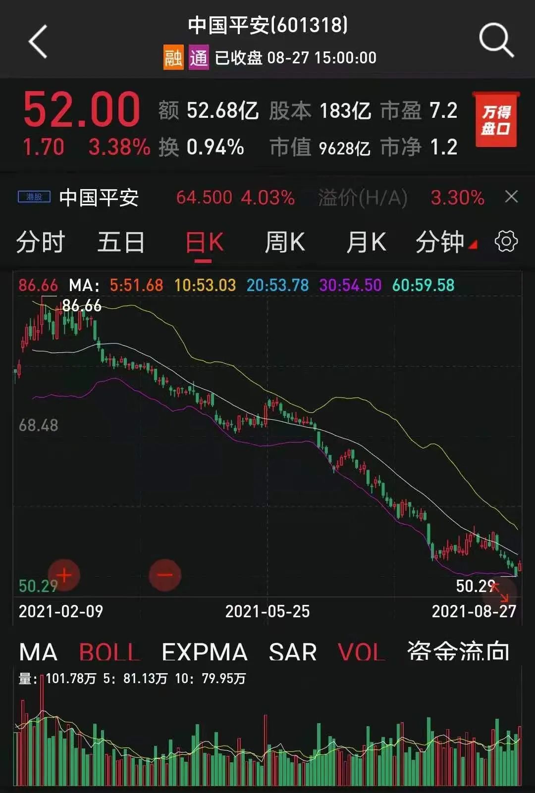 当日,中国平安股价也终于“扬眉吐气”,结束“六连阴”,上涨3.38%,收报52元/股,领涨保险板块。