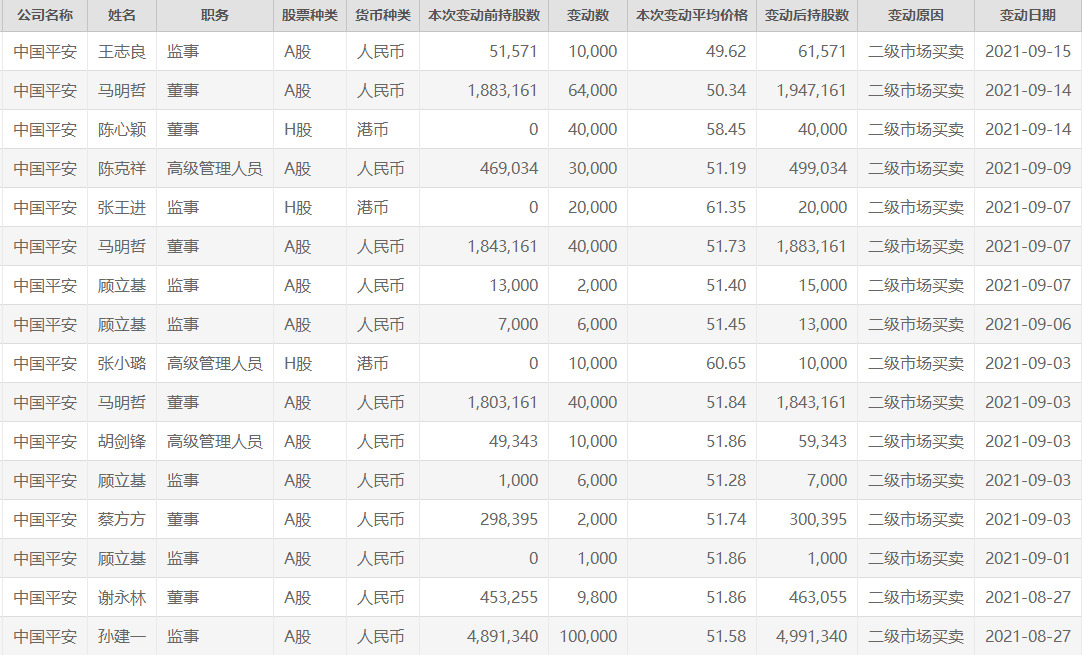 此外,8月27日至今,中国平安董事长马明哲率孙建一、谢永林、顾立基、蔡方方、胡剑锋、张小璐、张王进、陈克祥、陈心颖、王志良等高管合计增持公司股票16次。