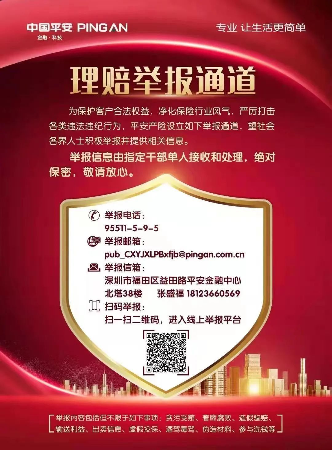 为保护客户合法权益,净化保险行业风气,严厉打击各类违法违纪行为,平安财险设立如下举报通道,望社会各界人士积极举报并提供相关信息。举报信息由指定干部单人接收和处理,绝对保密,敬请放心。
