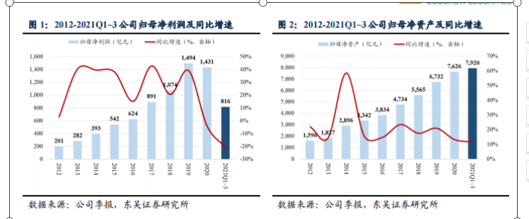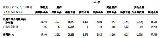 三季报显示, 2021 年前三季度,中国平安实现归母净利润 816.38亿元,同比-20.8%;期末归母净资产 7920.40 亿元,同比+11.6%;寿险新业务价值 352.37 亿元,同比-17.8%;财险综合成本率 97.3%,同比-1.8 pct;财险净利润 132.83 亿元,同比+20.2%。