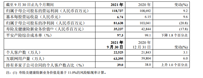 财报显示,2021 年前 3 季度,中国平安营运利润 1187 亿元,同比增长9.2%,主要受银行、财险、资管等板块带动,寿险营运利润737 亿元,同比下降2.3%,新业务价值352.37亿元,同比下降17.8%。