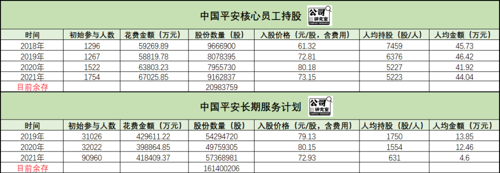 公开信息显示,中国平安自2015年起开始实施核心人员持股计划,参与对象为包括公司董监高在内的平安集团及其附属子公司的核心关键人员,资金来源为员工的合法收入及业绩奖金额度。截至报告期末,此项计划共实施七期,其中2015年至2017年三期已全部解禁完毕,2018年至2021年这四期有部分解禁。