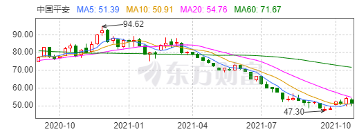 受疫情带来的冲击及踩雷华夏幸福的利空影响,从2020年11月底最高触及92.34元的高点后,中国平安A股的股价就开始一路下跌。截至10月29日收盘,2021年中国平安A股股价下跌超过40%,总市值蒸发3000多亿。