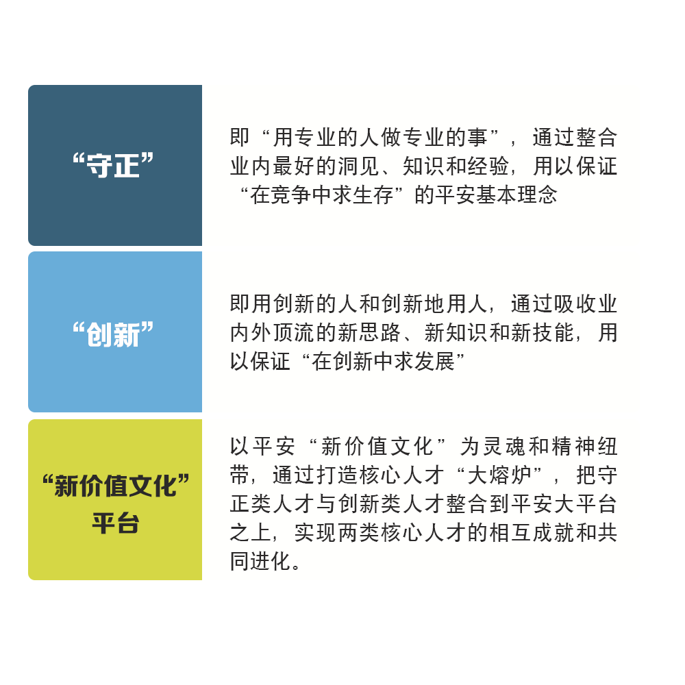 平安的新价值平台法则,解决的是守正类人才与创新类人才如何在一个平台上有效合作创新的问题,目的是打造两类核心人才最大化实现相互赋能、相互成就、相辅相成的“铁营盘”,从而构建平安生生不息、高效合作、持续创新的核心人才团队。