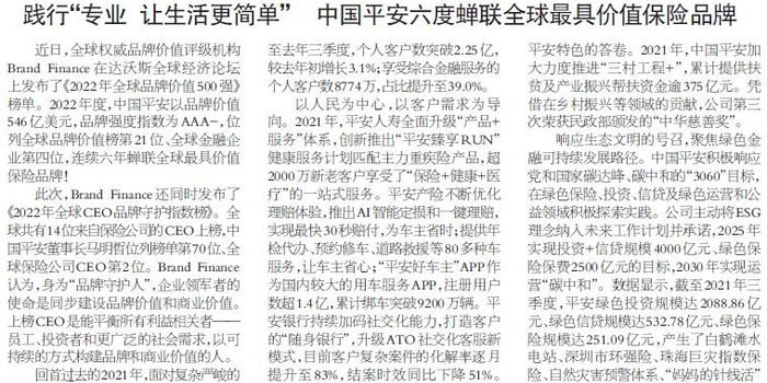 践行“专业 让生活更简单” 中国平安六度蝉联全球最具价值保险品牌
