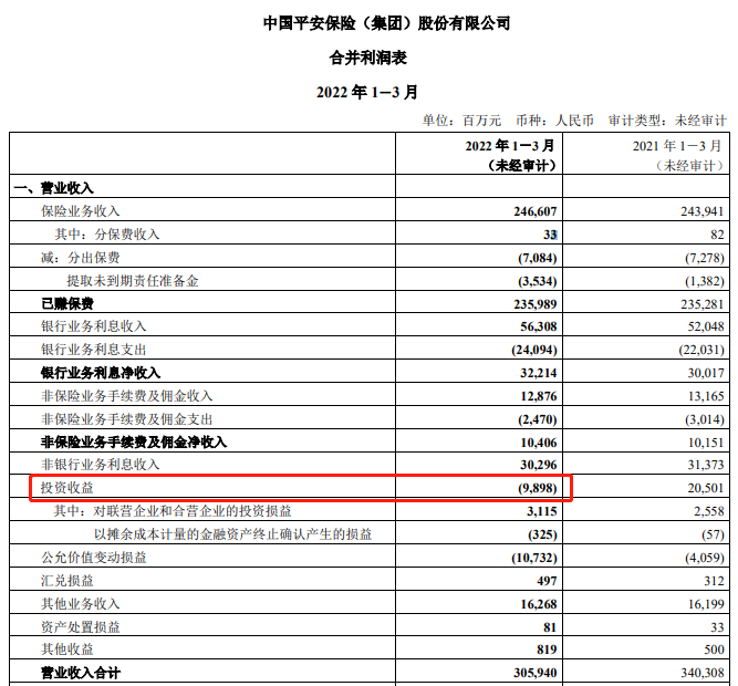 另值得一提的是,中国平安一季度的投资收益一度为负数,即亏损98.98亿元。而上年同期,平安的投资收益为205.01亿元。