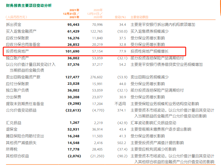 另悉,截至2021年12月31日,中国平安总资产为101,420.26亿元,同比增长6.4%,总负债为90,643.03亿元,同比增长6.1%。此外,投资性房地产为1016.9亿元,同比增长77.9%,主要变动原因为投资性房地产规模增长。