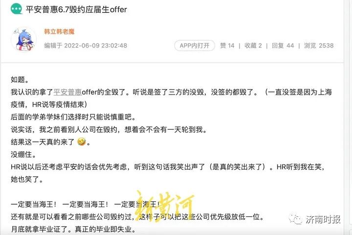 “月底就拿毕业证,要‘毕业即失业’了。”6月7日,应届毕业生“韩立韩老魔”在牛客网分享了她的求职经历:拿到平安普惠的offer后,被公司毁约。