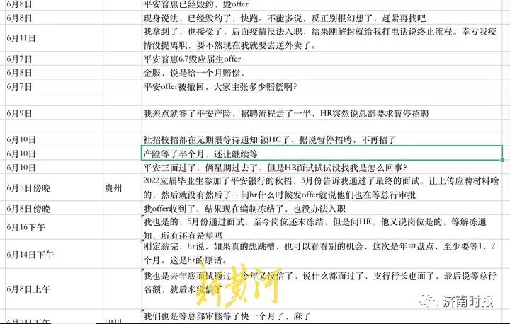 和微博相比,脉脉上更多求职者介绍了详细情况。5月底至今,近60名脉脉用户分享平安各子公司暂停招聘或毁约的遭遇。一名香港科技大学毕业生表示,她应聘的是深圳平安银行的汽车金融岗位,先后经历了四次面试,微信接到通知暂停(招聘)流程,“HR原话是暂停发offer,不要错过其他offer。谈完薪资并明确可以去实习后,直接终止流程。”