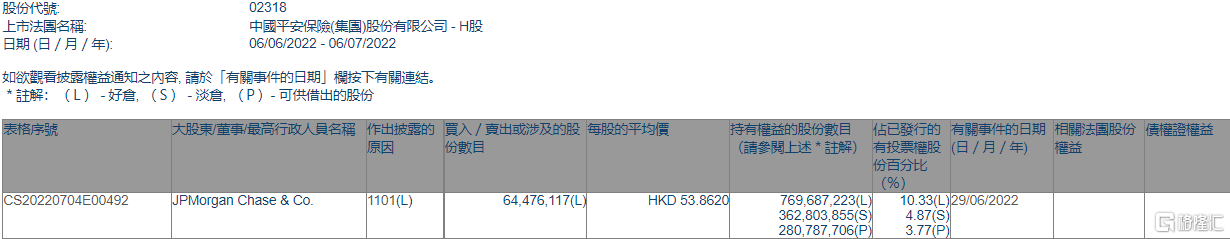 格隆汇7月6日丨根据联交所最新权益披露资料显示,2022年6月29日,中国平安(02318.HK)获JPMorgan Chase & Co.以每股均价53.862港元增持好仓6447.61万股,涉资约34.73亿港元。