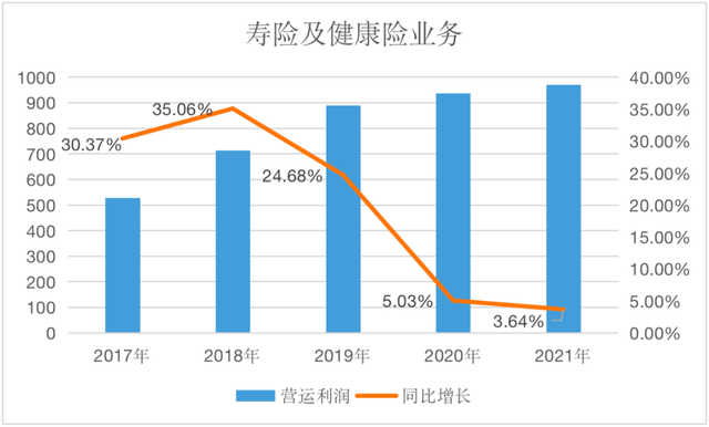 虽然寿险及健康险业务的营运利润一直正向增长,但增速却呈下降趋势,尤其是2020年和2021年,降幅直接跌到个位数,2021年营运利润占比也首次出现下降。