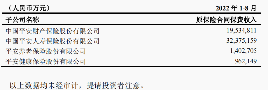 2022年9月14日,中国平安(601318.SH/02318.HK)披露的未经审计的保费收入情况显示,2022年前8个月,公司经由子公司合计实现原保险合同保费收入人民币5427.48亿元,同比增长2.06%。