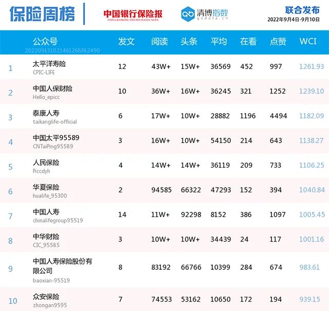 “保险周榜”今日发布第351期,该榜单对上周各保险机构官方微信、官方微博的相关数据进行整合、盘点和排行,包括微信和微博两类榜单。本期榜单的监测时间为2022年9月4日—10日。
