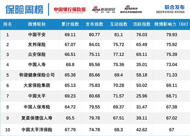 “保险周榜”由《中国银行保险报》与清博智能、新浪财经及新浪微热点大数据研究院铀媒联合推出。