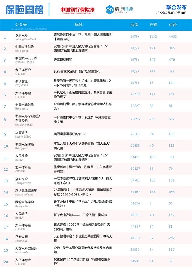 本期热文榜上,泰康人寿于中秋节前夕发布的留言参与互动话题讨论赢中秋节礼的推文,借助节日的热度赢得了较高关注,阅读数10万+,“在看”数1100+,点赞数4400+,高居榜首。中国人保财险发布的多措并举迅速应对“9·5”四川甘孜州泸定县6.8级地震的报道,收获了10万+阅读、近200“在看”和近1000点赞,排名第二。中国太平95589的热文以阅读数10万+、“在看”数100+、点赞数近500的佳绩位列第三。