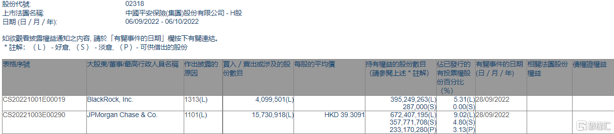 格隆汇10月6日丨根据联交所最新权益披露资料显示,2022年9月28日,中国平安(02318.HK)获JPMorgan Chase & Co.以每股均价39.3091港元增持好仓1573.09万股,涉资约6.18亿港元。