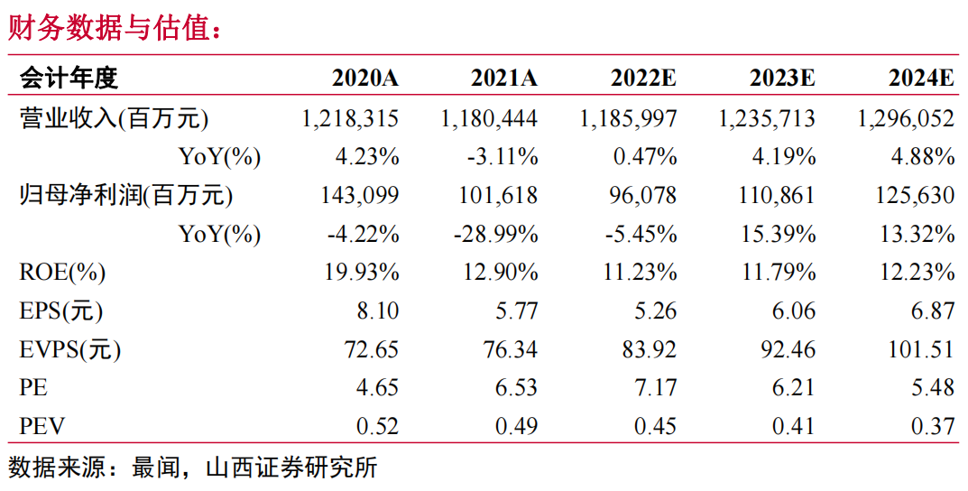 预计公司2022-24E 归母净利润960.8、1108.6和1256.3亿元,同比-5.45%、+15.39%、+13.32%。公司当前股价对应2022E P/EV 0.45x,处近5年以来绝对低位。考虑到公司坚定推荐渠道产品改革,且目前产品结构好转、代理人虽规模流失但质量提升,我们认为公司业绩或将渐入佳境,给予公司“买入-A”评级。