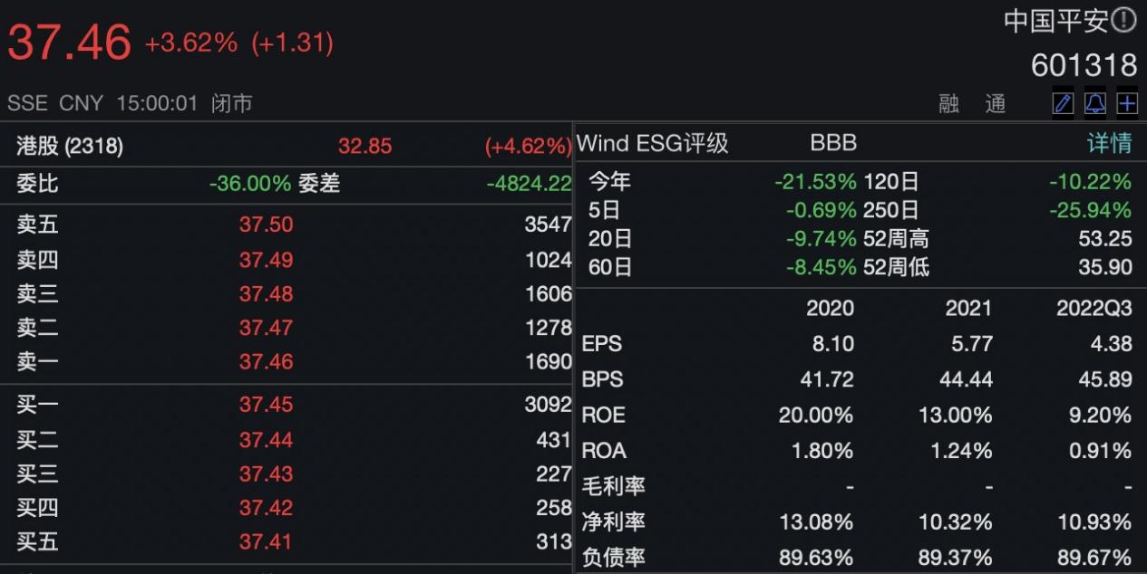 11月1日,在A股全线反弹的行情下,保险板块也震荡走强。其中,中国平安报收37.46元,涨幅3.62%。