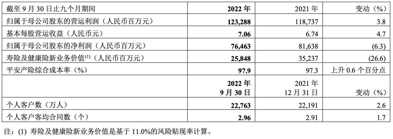 2022年前三季度,寿险及健康险业务实现营运利润864.86亿元,同比增长17.4%;新业务价值258.48亿元,同比下降26.6%。若去年前三季度新业务价值采用去年年底假设及方法重述,2022年前三季度新业务价值则同比下降18.9%。