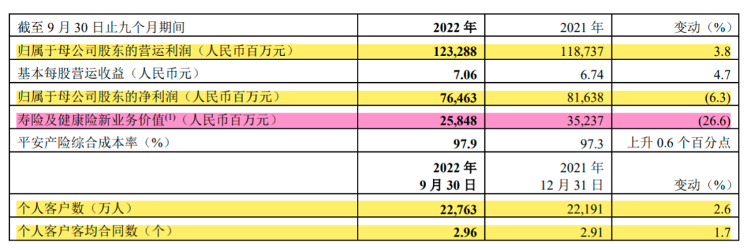 截至9月末,中国平安的个人客户数近2.28亿,客均合同数2.96个,较年初增长了1.7%。代理人人均新业务价值同比提升超22%;寿险及健康险业务营运利润864.86亿元,同比增长17.4%;13个月保单继续率同比提升。