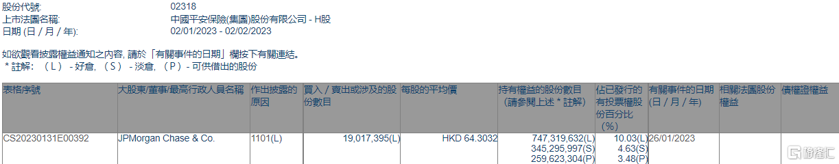根据联交所最新权益披露资料显示,2023年1月26日,中国平安(02318.HK)获JPMorgan Chase & Co.以每股均价64.3032港元增持好仓1901.74万股,涉资约12.23亿港元。