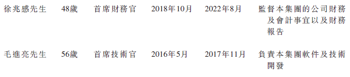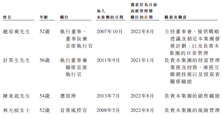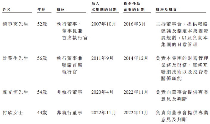 高管包括首席执行官赵容奭先生、联席首席执行官计葵生先生这2名执行董事,以及总经理陈东起先生,首席风控官林允祯女士,首席财务官徐兆感先生,首席技术官毛进亮先生。
