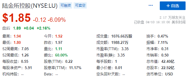陆金所,于2020年10月30日在美国纽交所IPO上市,股票代码为“ LU ,当时发行1.75亿份ADS,发行价为13.5美元,募资约23.63亿美元。截至2023年4月10日美股收市,陆金所每股报1.85美元,总市值44.40亿美元。