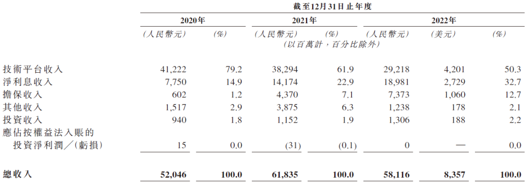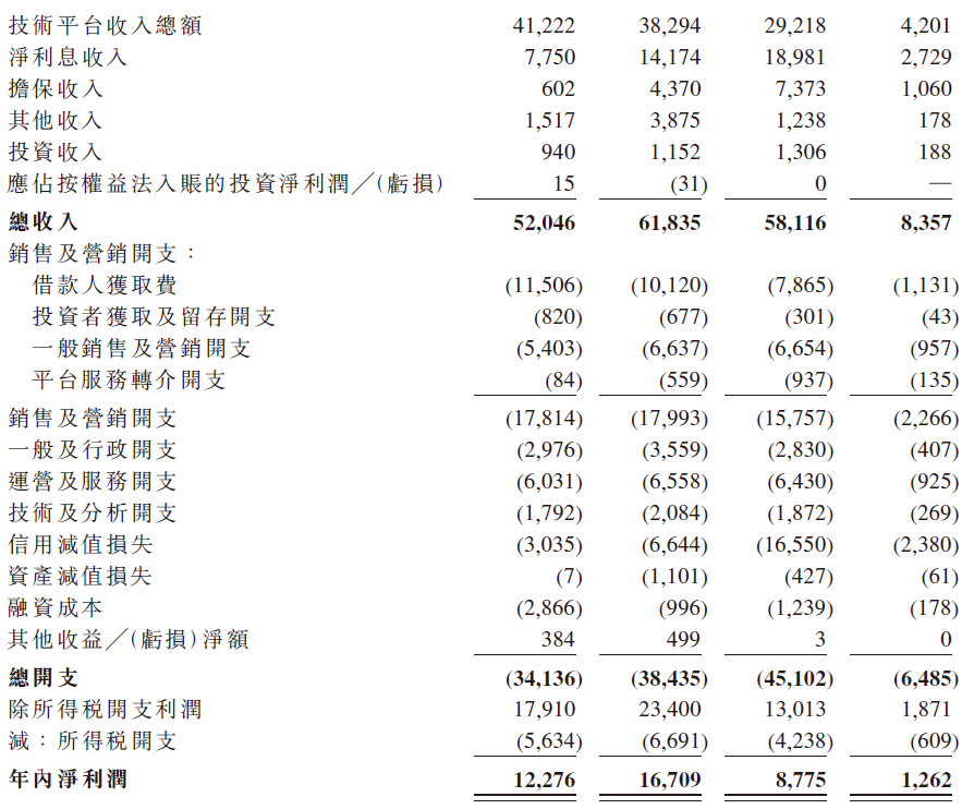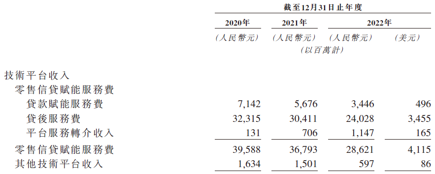陆金所主要收入来自核心的零售信贷赋能业务,借款人就贷款支付费用,包括贷款人的利息、担保人或保险公司的担保或保险费以及赋能方的赋能服务费,除核心的零售信贷赋能业务模式外,陆金所就通过陆金通向银行合作伙伴提供转介服务赚取平台服务转介收入,就分销金融机构的产品产生的服务费赚取其他技术平台收入,就公司的消费金融子公司提供的贷款赚取净利息收入,并赚取账户管理服务费、罚金及其他服务费等其他收入。