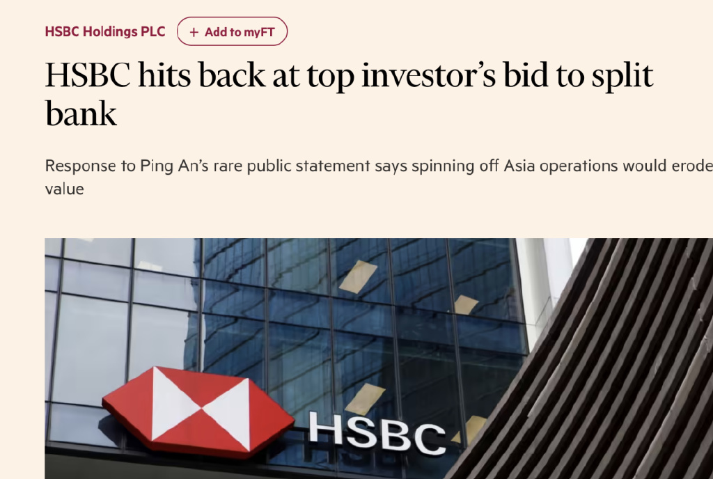 //汇丰:不同意最大投资者提出的分拆