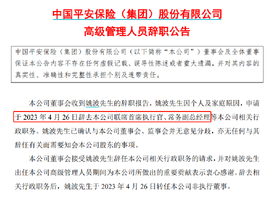 另据中国平安发布公告称,董事会收到姚波辞职报告,因个人及家庭原因,申请辞去公司联席首席执行官、常务副总经理等本公司相关行政职务。