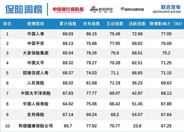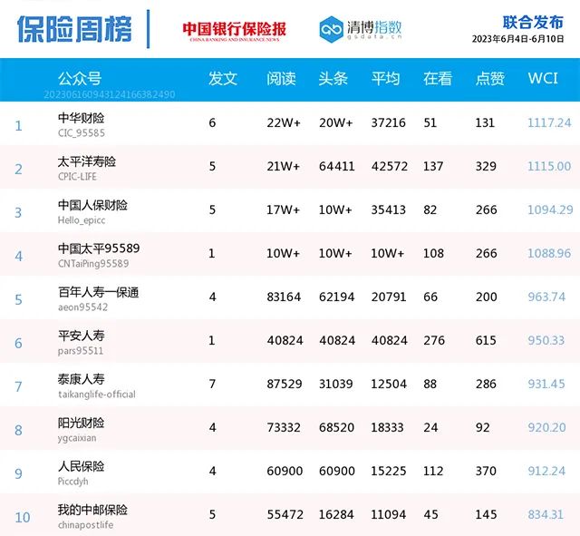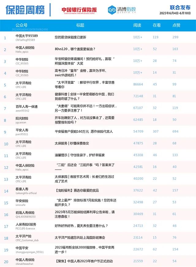 “保险周榜”今日发布第379期,该榜单对上周各保险机构官方微信、官方微博的相关数据进行整合、盘点和排行,包括微信和微博两类榜单。本期榜单的监测时间为2023年6月4日—6月10日。