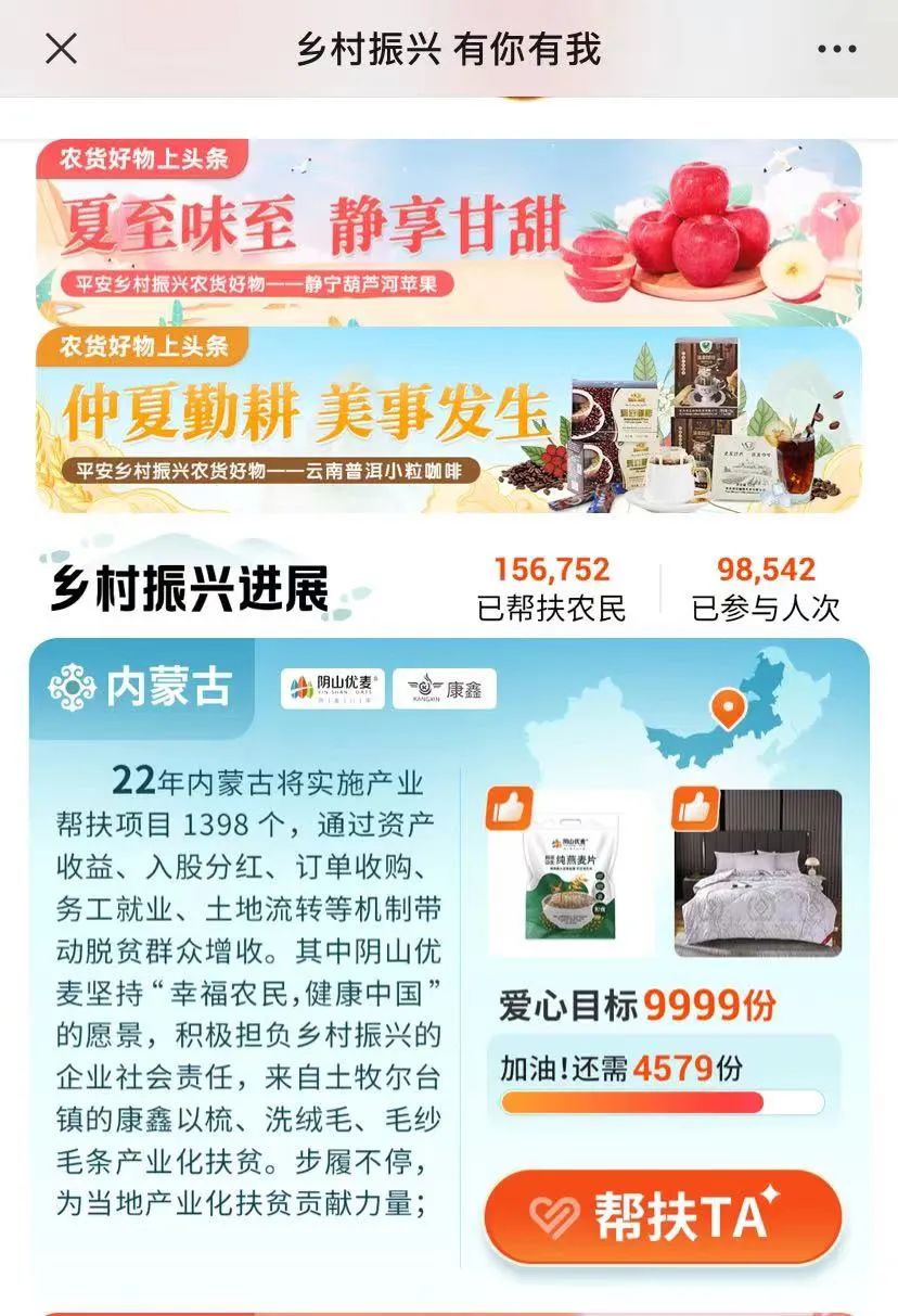 产后助销。平安打造了两种消费帮扶模式:一是集团采购,在乌兰察布、上海、广州、西安、广西罗城等地召开了多场农产品推介洽购会,集团内部优先采购帮扶地区农牧产品;二是平台协销,利用旗下的“平安壹钱包”、“平安好车主”等线上渠道引流帮助销售。通过平安集团工会积极开展消费帮扶工作,截至2022年底,平安集团的消费帮扶总金额已超7亿元。