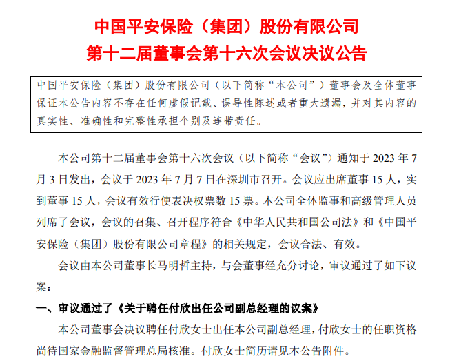 7月7日,中国平安保险(集团)股份有限公司发布公告,公司董事会决议聘任付欣出任副总经理,其任职资格尚待国家金融监督管理总局核准。
