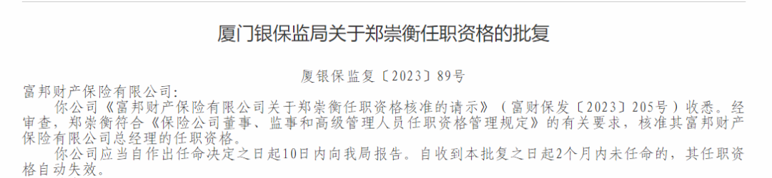 7月7日,厦门银保监局发布行政许可信息,核准郑崇衡富邦财产保险有限公司(以下简称“富邦财险”)总经理的任职资格。