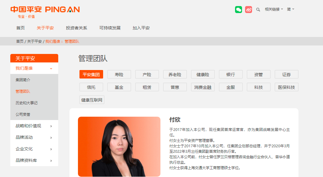 资料显示,付欣今年43岁,于2017年10月加入中国平安,现任中国平安首席运营官兼战略发展中心主任,曾任中国平安副首席财务执行官、企划部总经理。